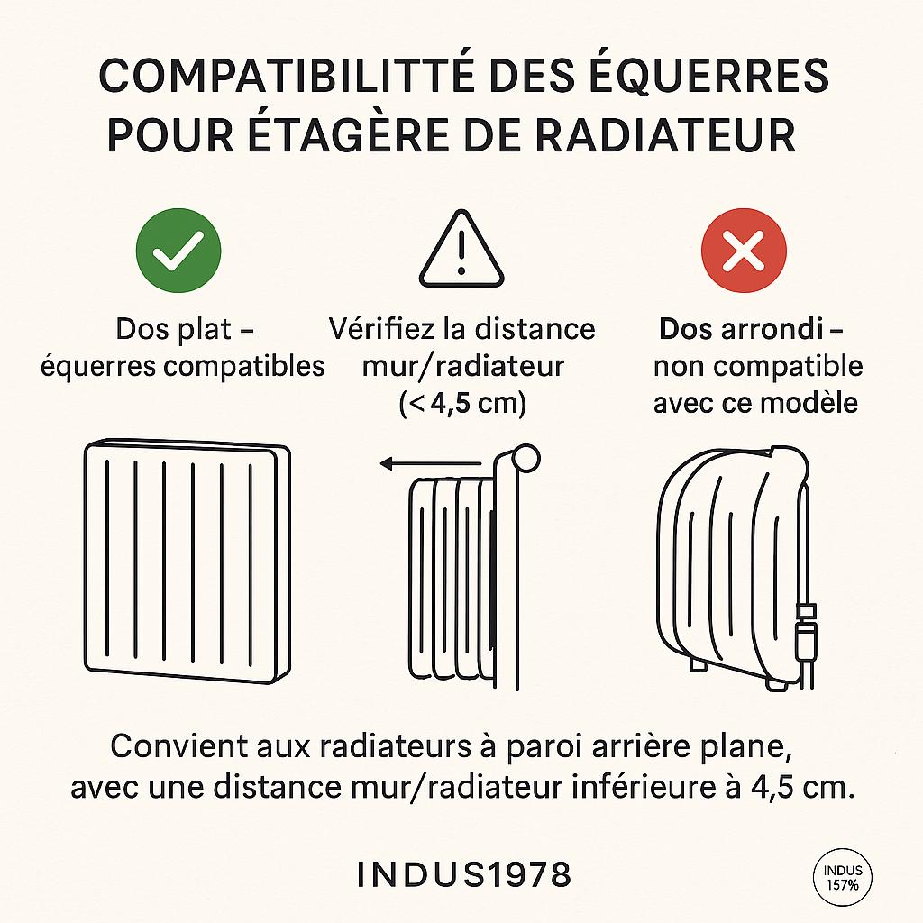 Fits radiators with a flat back panel and a wall/radiator gap of less than 4.5 cm.