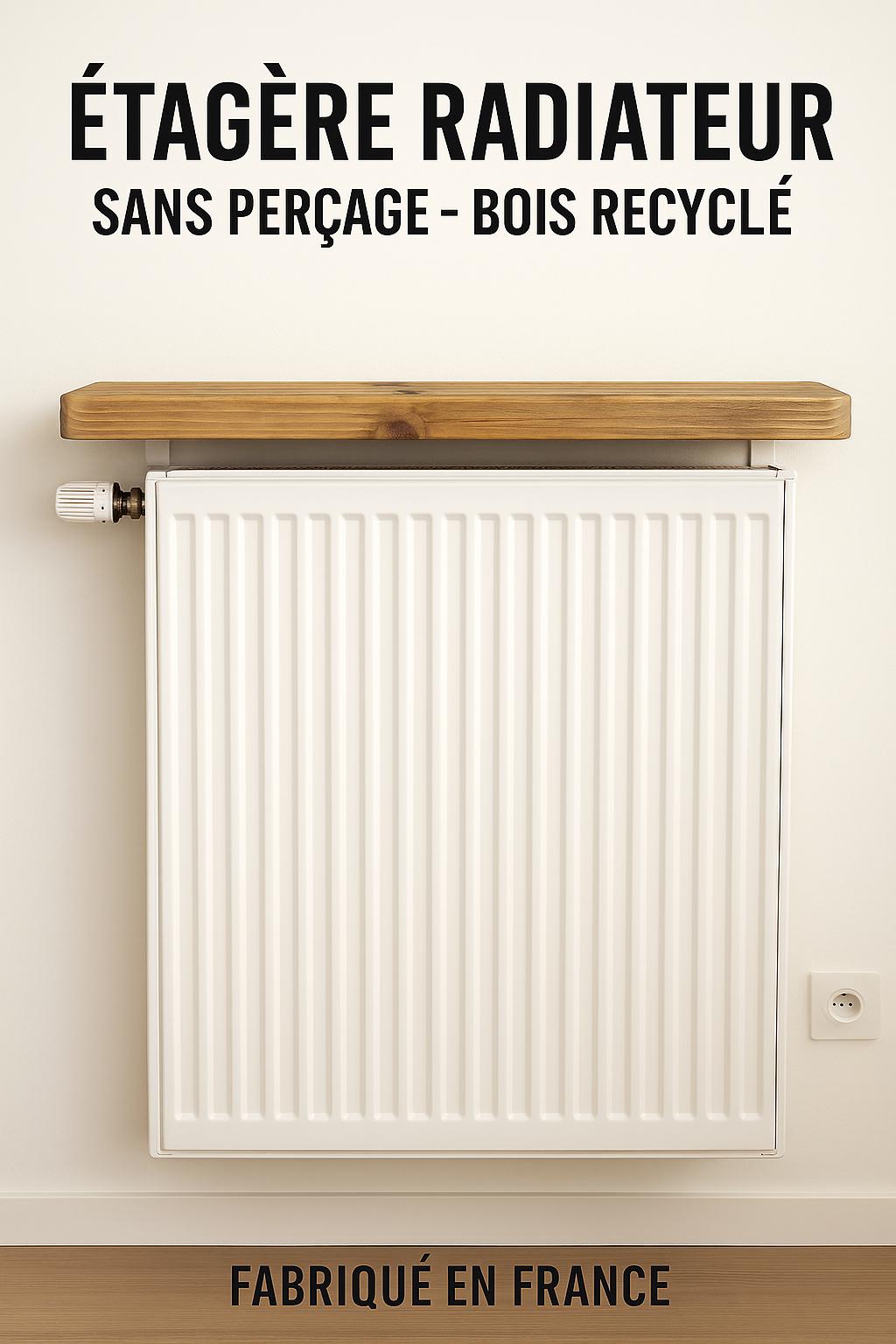 Recycled wood radiator shelf β no drilling β industrial style. Handmade in France, invisible brackets, free shipping.